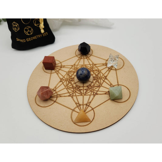 7-Piece Chakra Sacred Geometry Crystal Set with Grid & Velvet Pouch