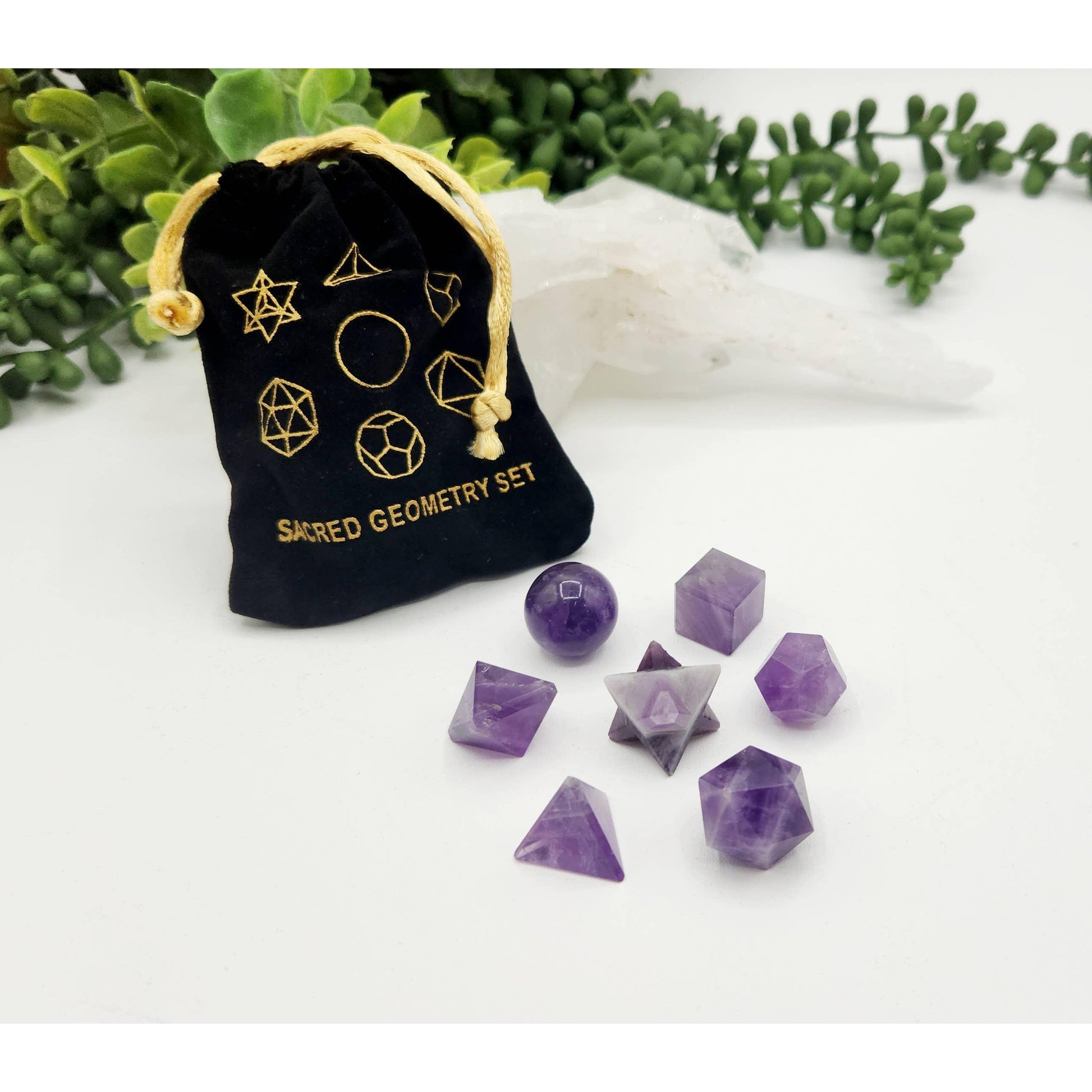 Unlock the sacred power of geometry and healing with our Amethyst 7-Piece Sacred Geometry Crystal Set. Carved from natural Amethyst, this stunning collection includes the 7 Platonic Solids, representing the foundational shapes of creation in sacred geometry.