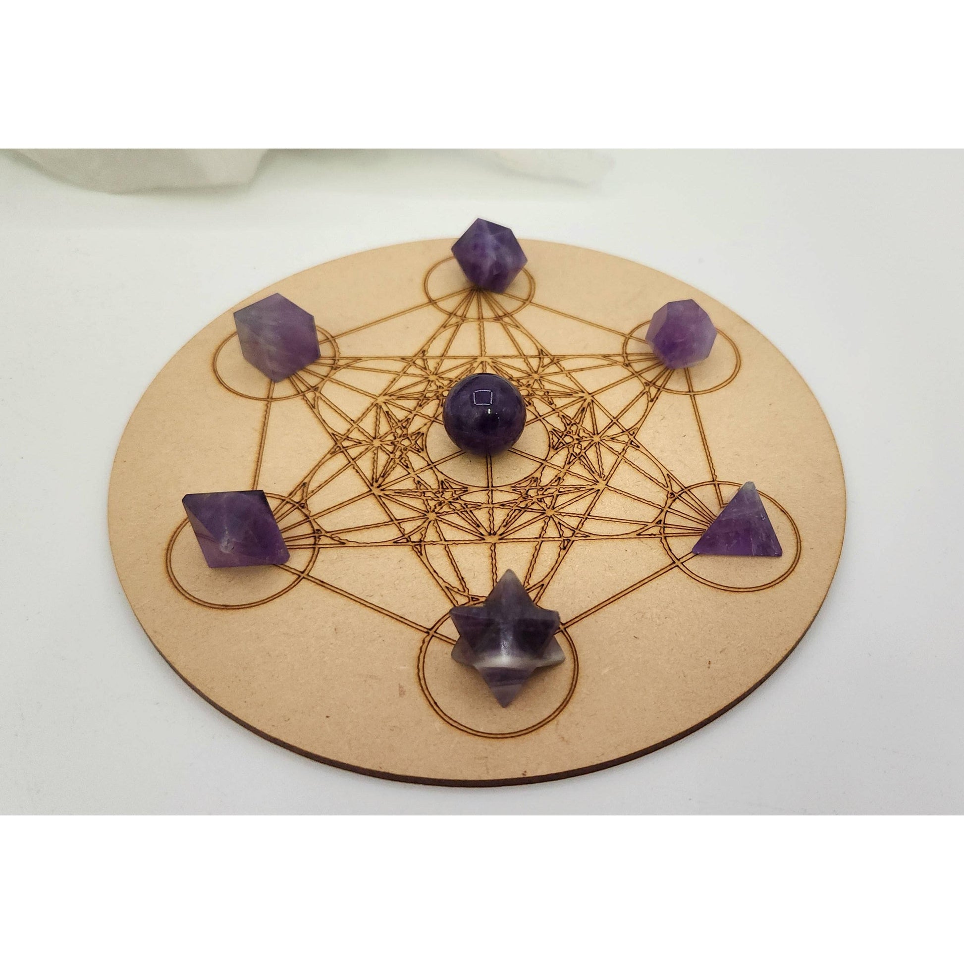 Amethyst 7-Piece Sacred Geometry Crystal Set with Wooden Grid & Velvet Bag