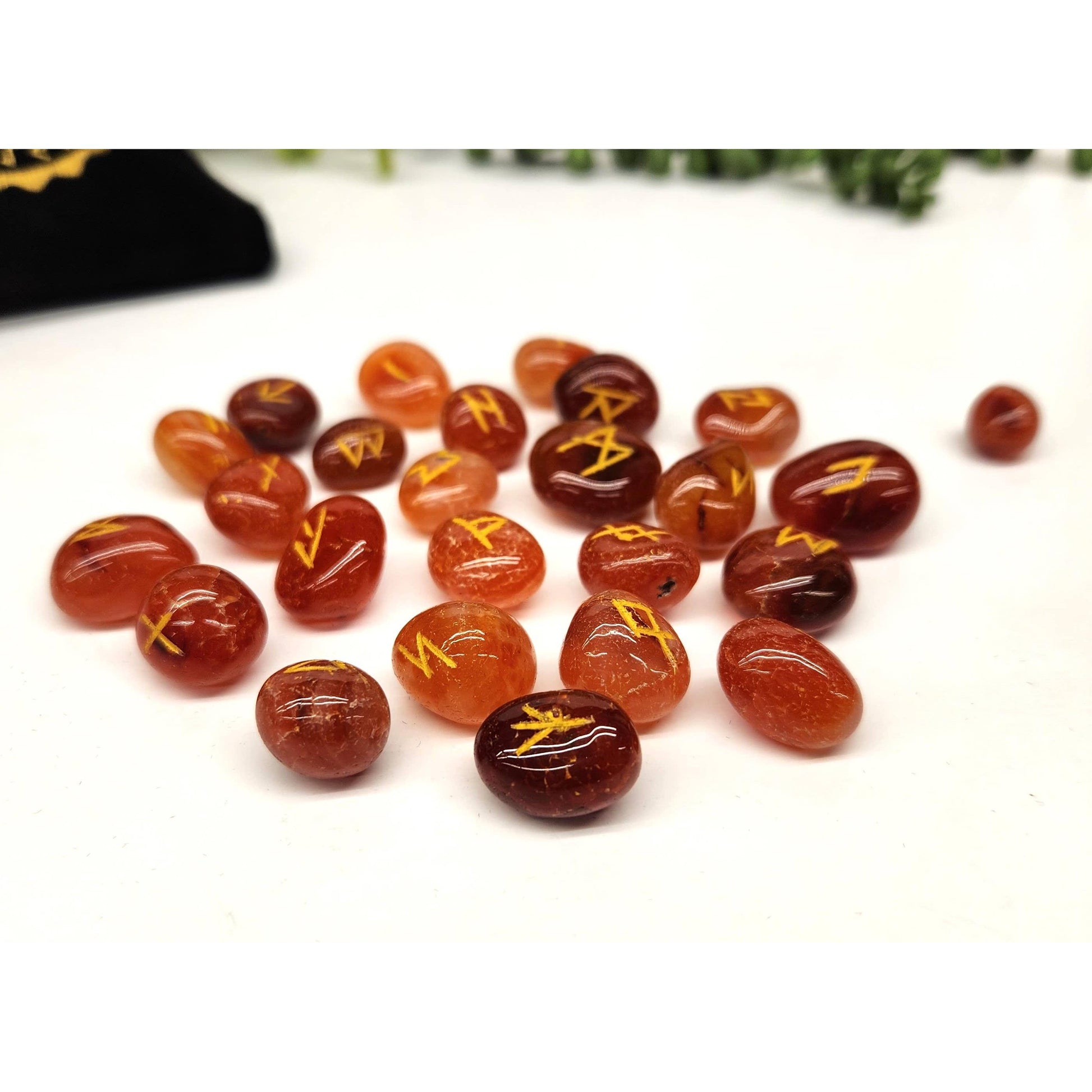 Tap into the ancient energy of Norse divination with this stunning 24-Piece Carnelian Rune Set. Each rune is meticulously engraved into vibrant Carnelian crystals and highlighted with shimmering gold detailing, making them both beautiful and powerful tools for your spiritual practice.