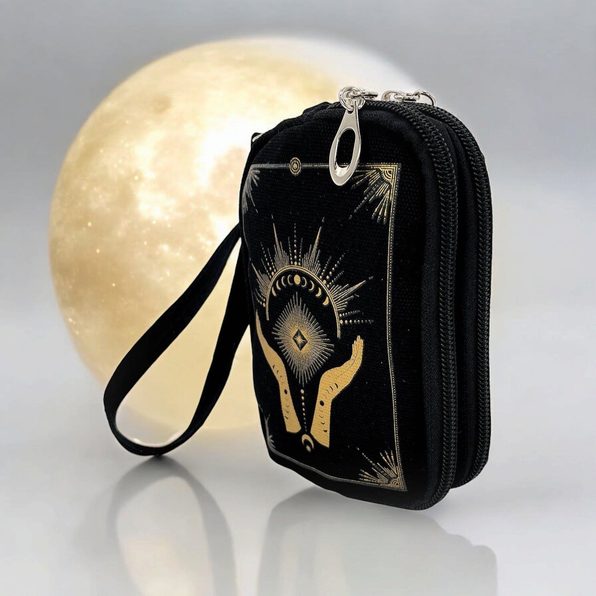 Step into the cosmos with the Celestial Hands Wristlets, a stylish and spiritual accessory that blends functionality with mystical charm. Whether you're heading to a moonlit market, sacred gathering, or just running errands, this compact wristlet is your go-to for carrying essentials with cosmic flair.