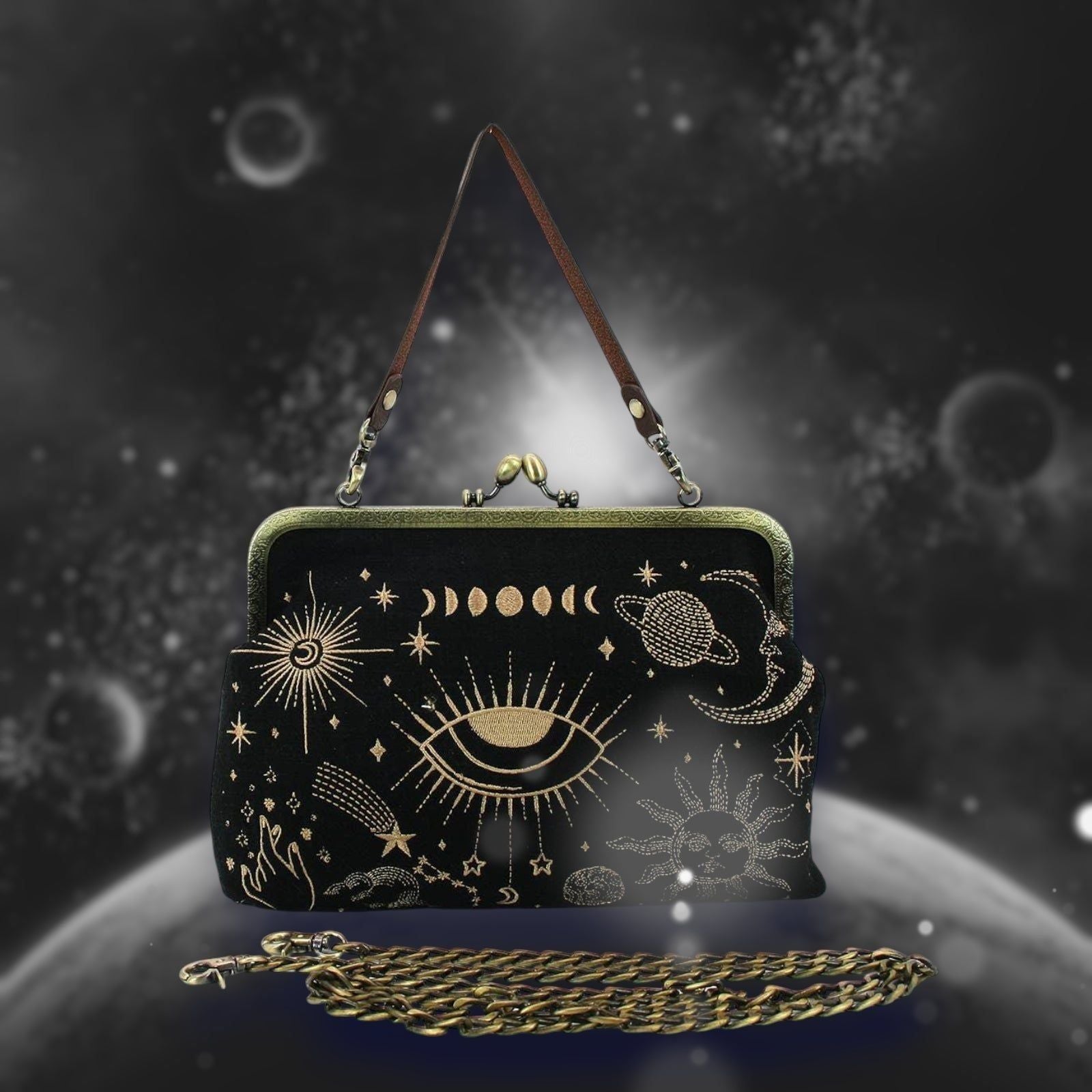 Celestial Kisslock Bag – Vintage Cosmic Chic with Interchangeable Straps
