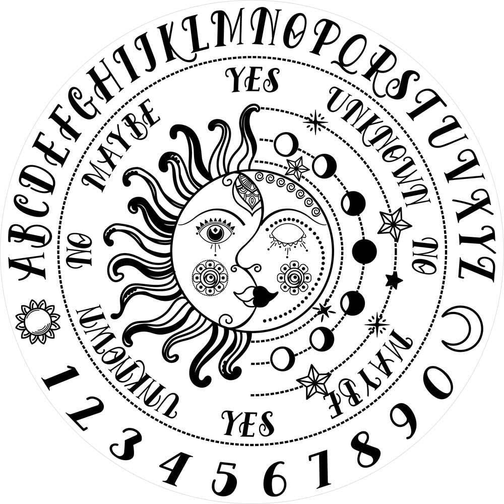 This 10" Celestial Wooden Pendulum Board comes in white and features a whimsical Sun and Moon design. With the alphabet, numbers, and typical answers, let the powers of the Universe help answer your questions.
