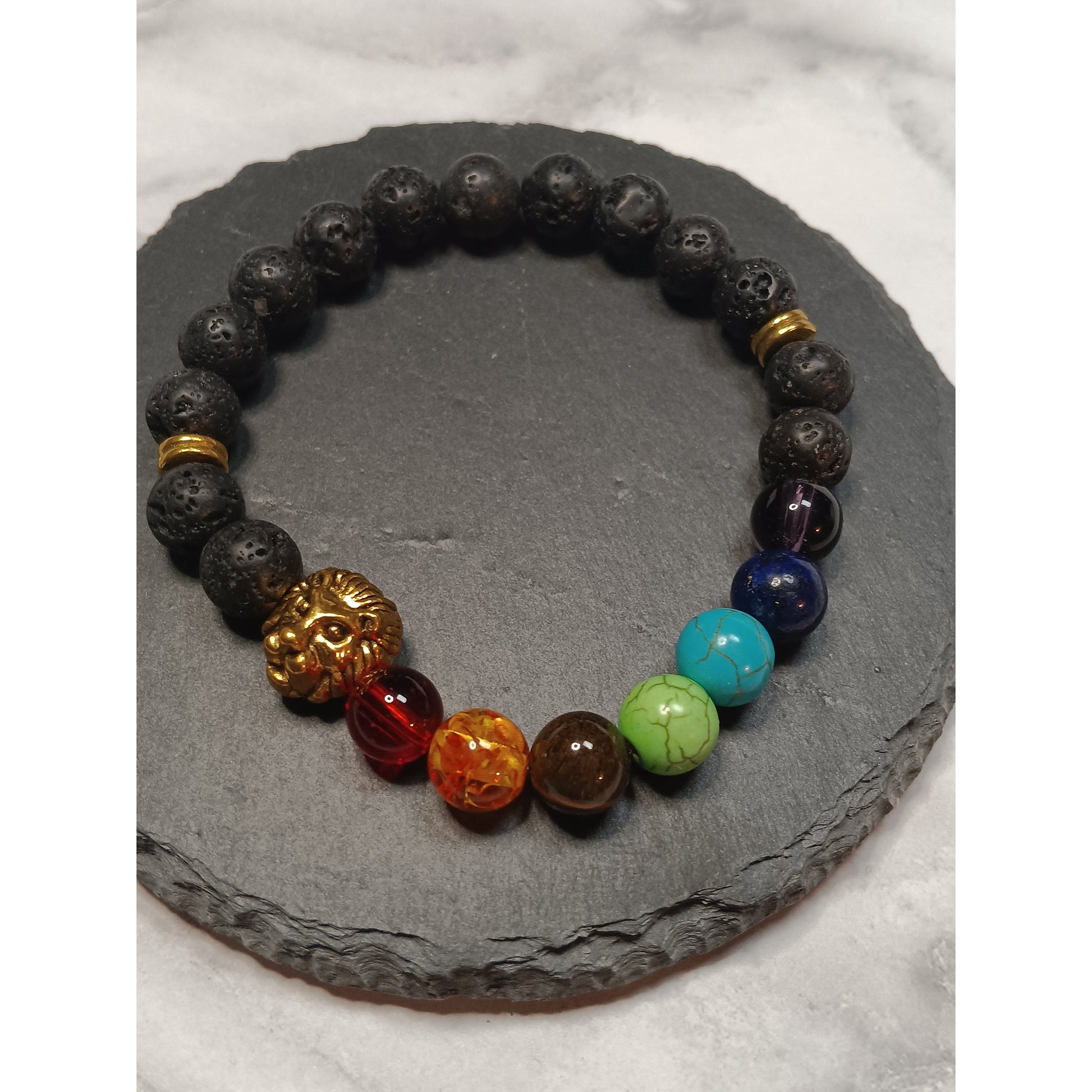 This Lava & Glass Beads Chakra Bracelet features 8mm natural lava beads, colorful glass beads representing the seven chakras, and a striking gold-tone lion head charm symbolizing strength, courage, and leadership. Its flexible stretch design ensures a comfortable fit for most wrists.
