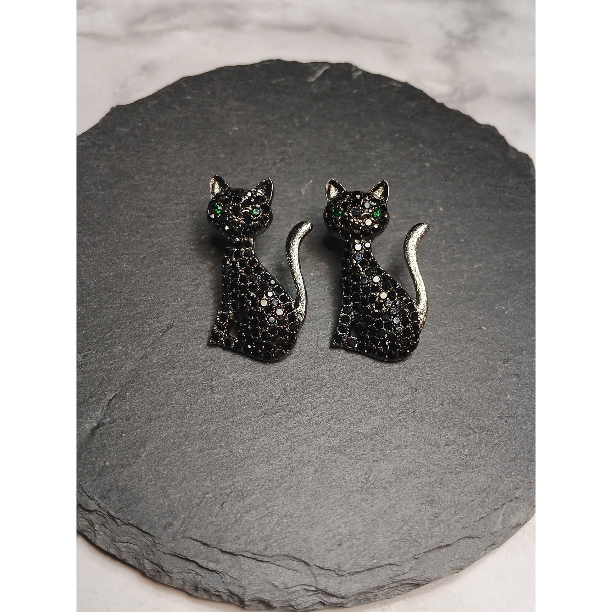 Add a dash of mystical charm and feline flair to your accessory collection with these eye-catching Studded Black Cat Earrings. Covered in dazzling black gems from head to paws, these earrings are the purr-fect way to showcase your love for cats with a touch of glamour. Their vivid green gem eyes sparkle with personality, while their sleek silhouette adds a witchy, mysterious vibe to any outfit. Lightweight and comfortable with secure post backs, they’re ideal for everyday wear or spooky season statements.