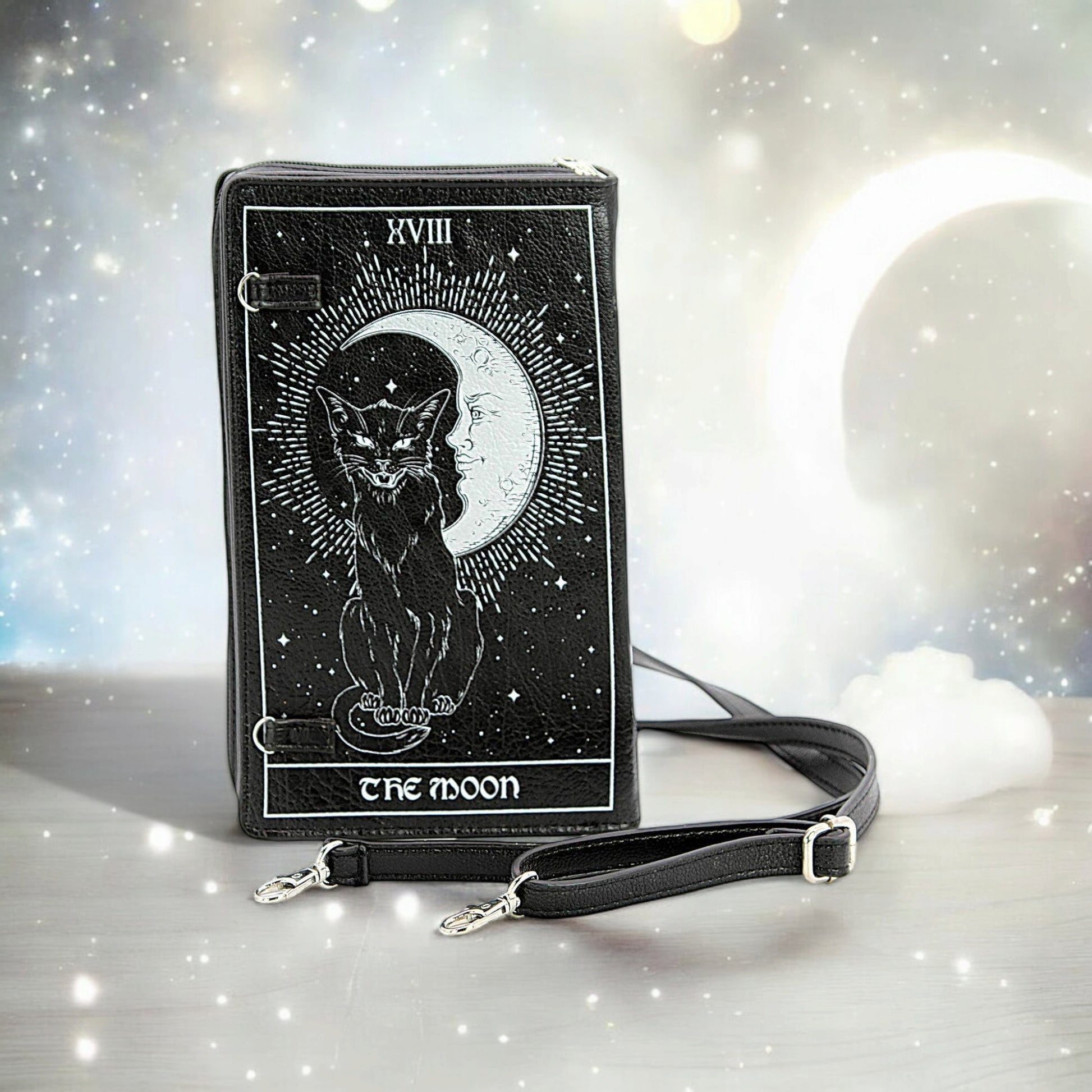 Carry your essentials in mystical style with the Tarot Card Book Crossbody Bag. Featuring a striking double-sided tarot card print and crafted from high-quality vinyl, this bag is more than just eye-catching, it's practical too. The book style allows ample room with dual compartments divided by a zippered pocket. With a fabric-lined interior, and both wristlet and shoulder strap options, it adapts effortlessly to your lifestyle.
