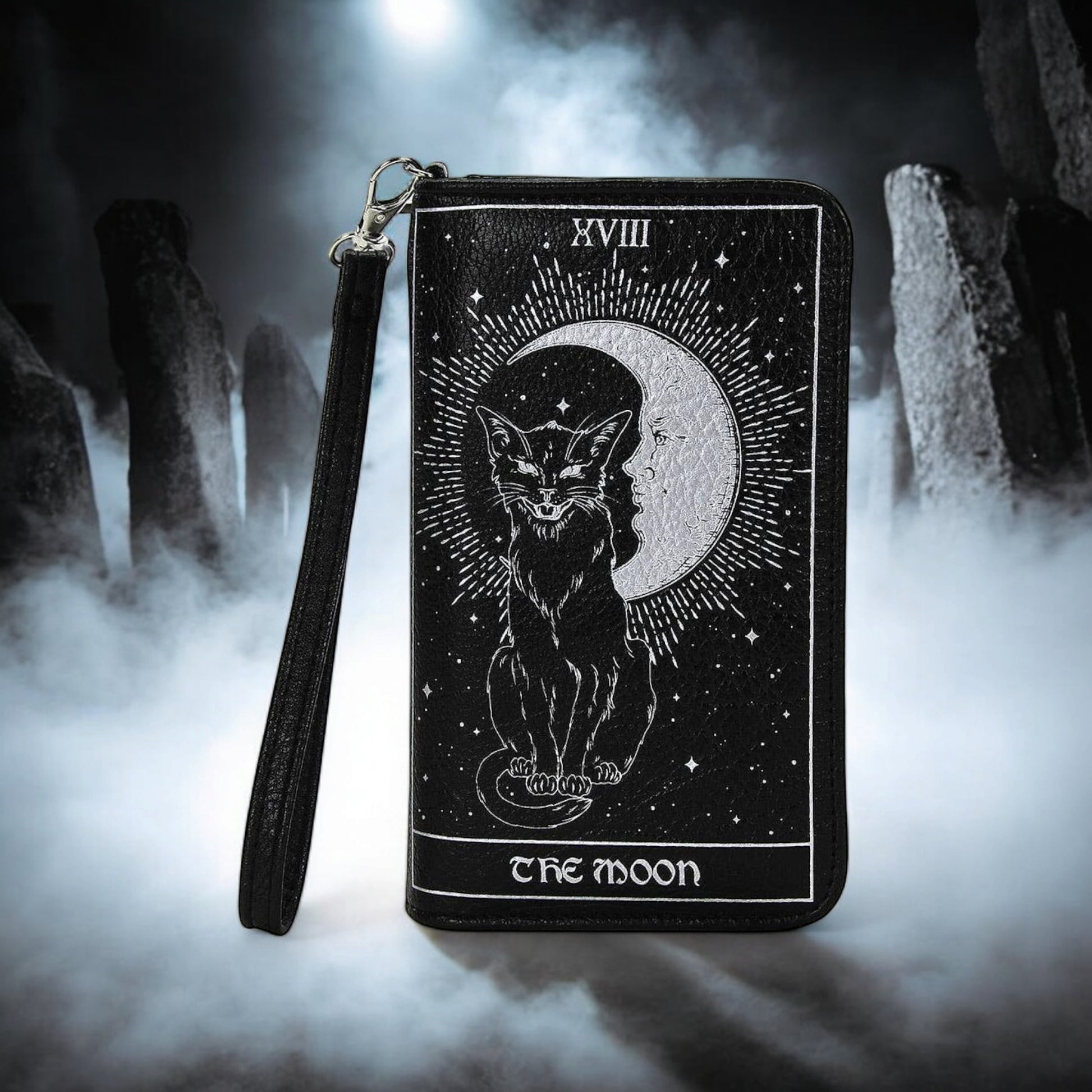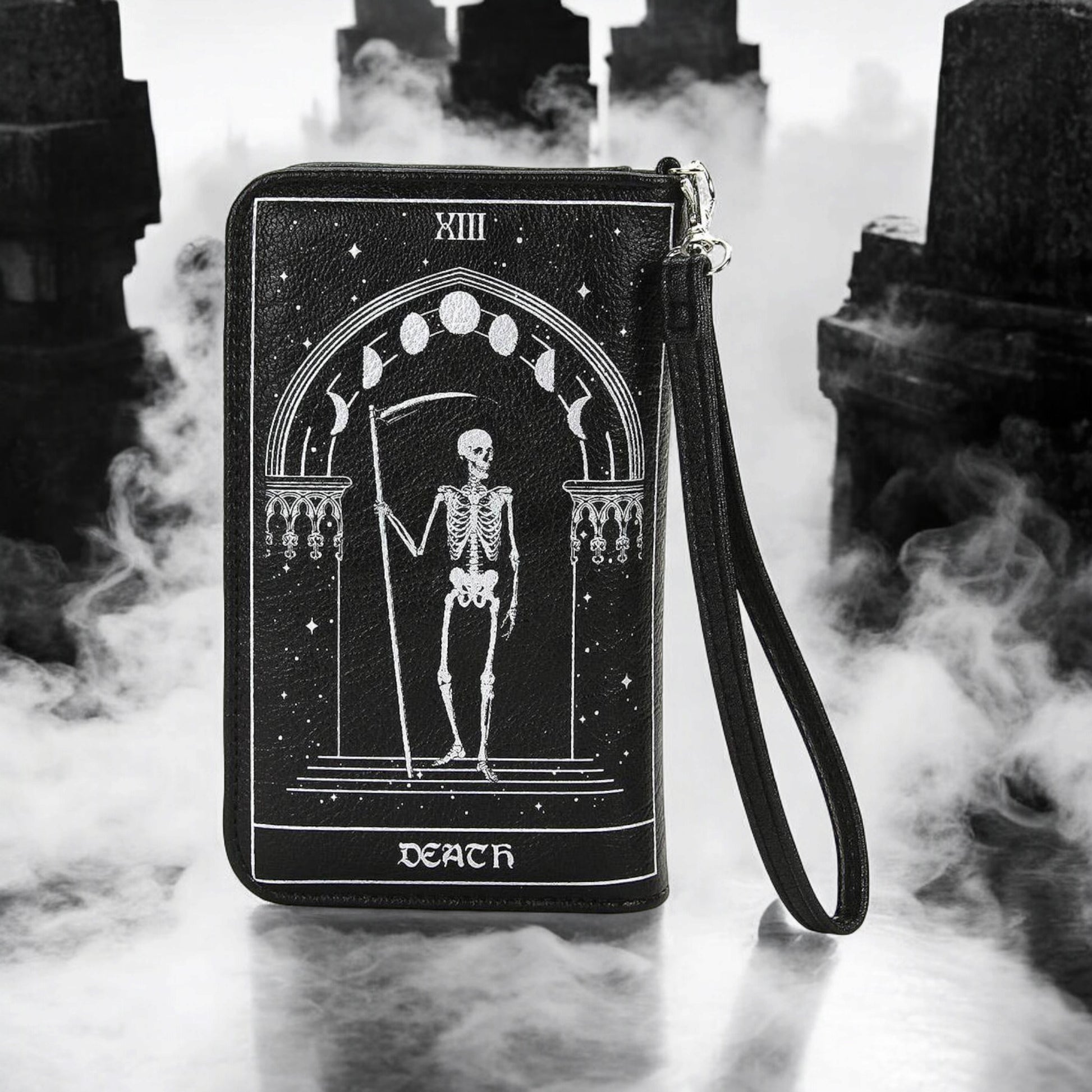 The Tarot Card Wallet brings mystical beauty to everyday utility. Adorned with a matching double-sided tarot card cover print, this high-capacity wallet features 9 card slots, a zippered pocket, bill compartment, and a transparent ID slot, plus a 7" detachable wristlet for grab-and-go convenience.